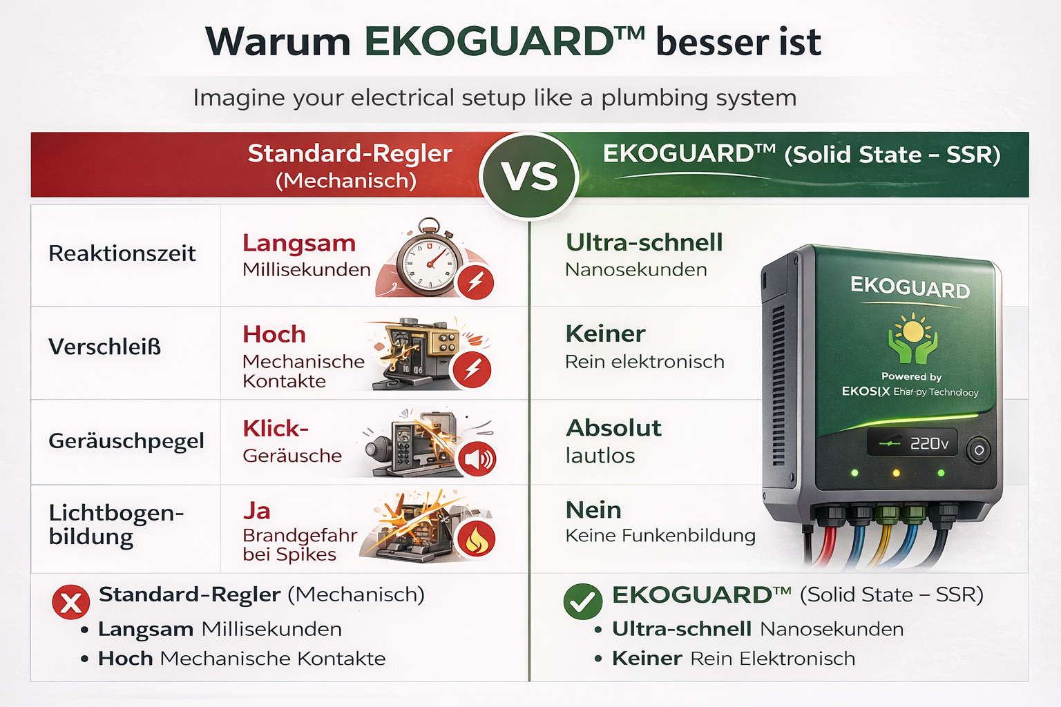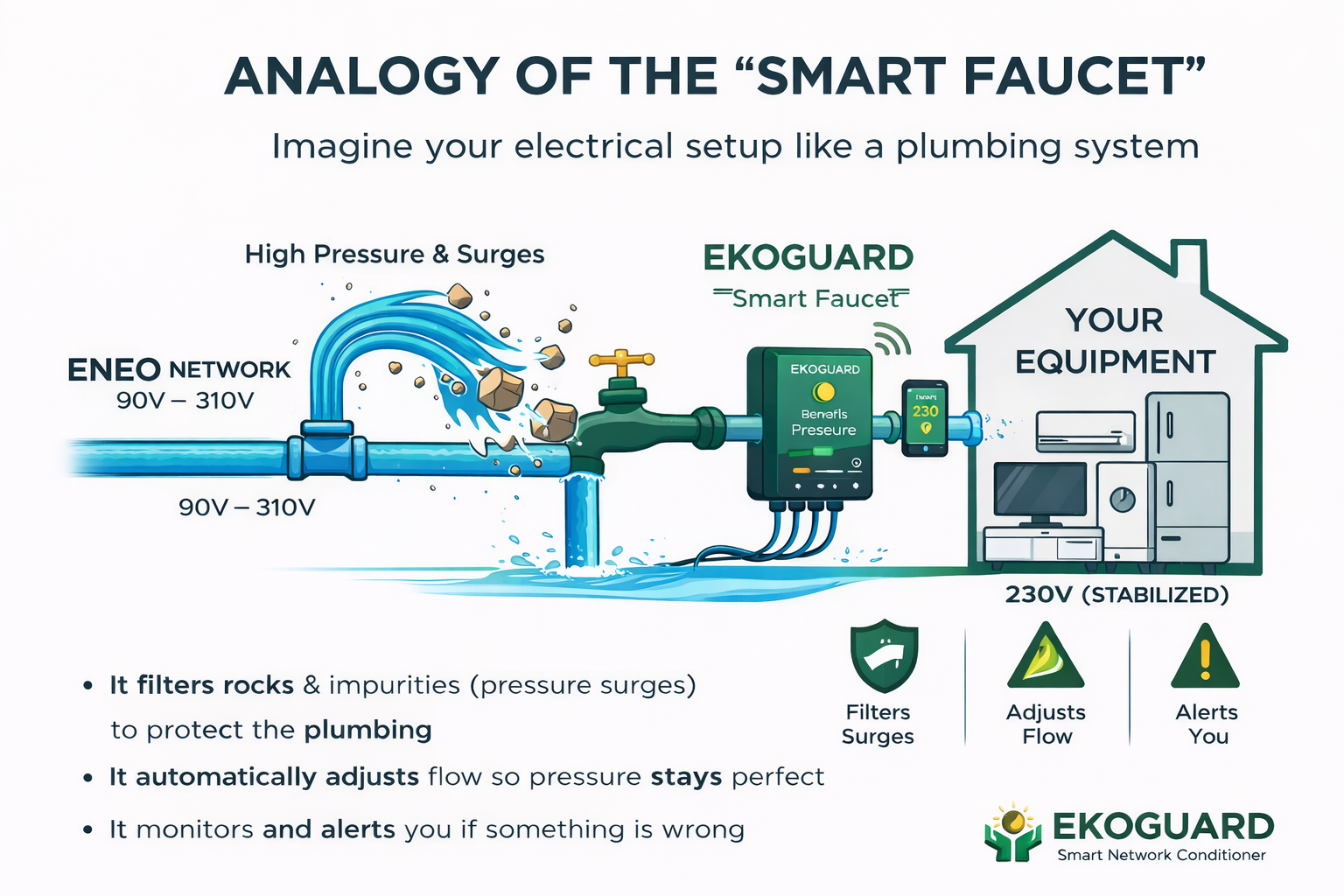 Stellen Sie sich EKOGUARD wie einen intelligenten Wasserhahn vor: Wenn der Druck (die Spannung) im Netz gefährlich steigt, reguliert oder schließt das System sofort, um Ihre wertvollen Endgeräte vor dem 'Bersten' zu schützen.