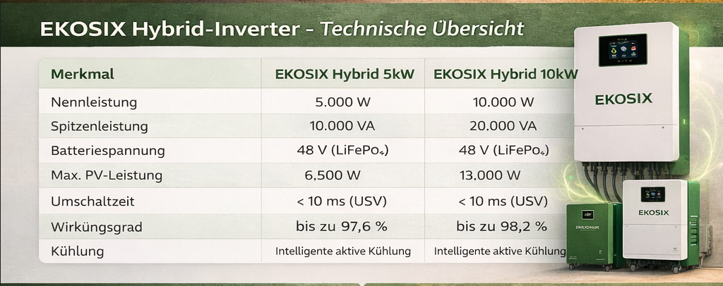 In einem Umfeld, in dem das öffentliche Stromnetz unzuverlässig ist, muss ein Wechselrichter mehr können, als nur Gleichstrom in Wechselstrom umzuwandeln. Die EKOSIX Hybrid-Serie fungiert als intelligenter Manager zwischen Solarmodulen, Batterien, dem öffentlichen Netz und Ihren Verbrauchern. Unsere Inverter sind darauf ausgelegt, auch bei extremen Netzschwankungen einen unterbrechungsfreien Betrieb (True USV-Funktion) zu garantieren.