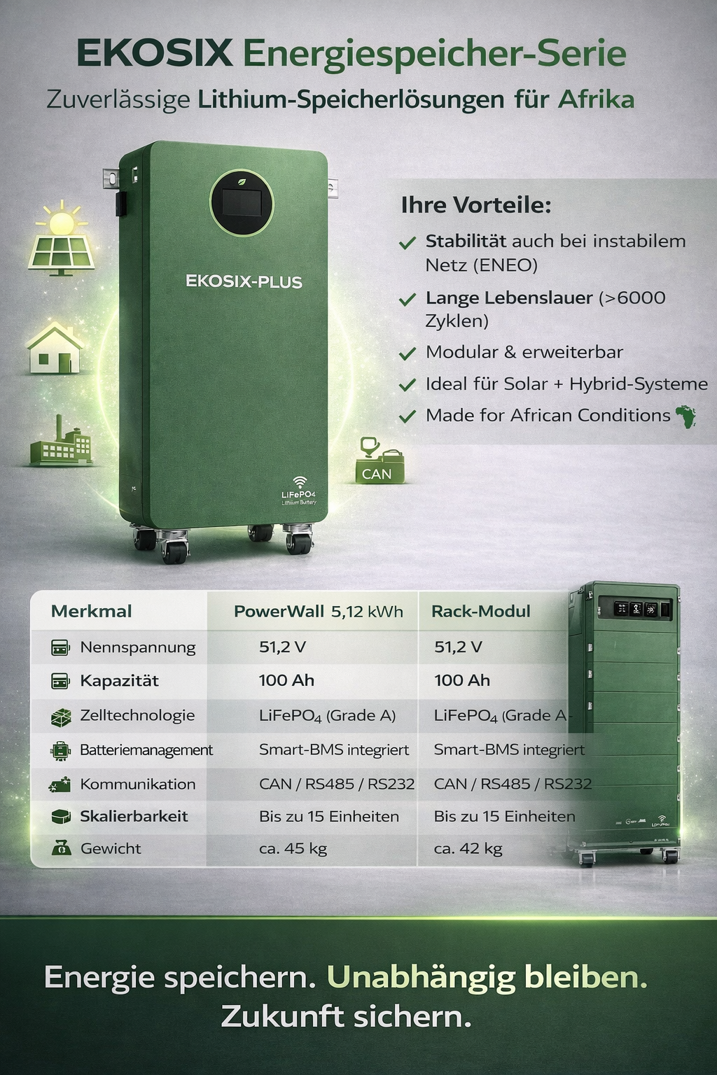 In Afrika führen extreme Hitze und tiefe Entladungen dazu, dass herkömmliche Gel- oder Bleibatterien oft in weniger als zwei Jahren versagen. Bei EKOSIX setzen wir auf Resilienz. Unsere Lithium-Eisenphosphat-Speicher (LiFePO4) sind keine einfachen Batterien – sie sind eine langfristige Investition, entwickelt für eine Betriebsdauer von zwei Jahrzehnten, selbst bei Umgebungstemperaturen von über 45°C.